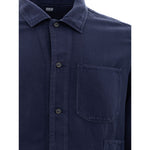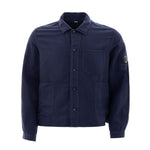 C.P. Company Linen Blend Shirt with Pockets. Blue colour, front fastening with buttons, two front patch pockets and pocket on the side, jacket model. Black logo applied on the sleeve. Composition: 51% Cotton, 49% Linen-Sku inside:24AP15